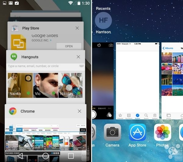 至于多任务,Android L重新设计了最近使用的应用的界面。以卡片的形式来显示最近使用的应用,而不是像以前那样显示在一栏之中。但是另一方面,要切换到一款最近使用的应用中还是有点不方便。在 iOS 8 中却是不一样的体验。iOS 8 的多任务既简单又实用。应用按时间顺序排列,与相应的图标一起自成一行。另外,菜单中还有最近联系人列表,用起来非常方便。