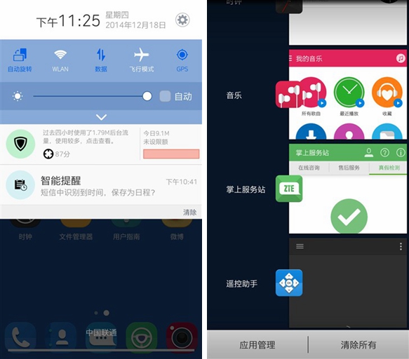 我们通过下滑屏幕,就会看到了通知栏和快捷开关,实用高效;同时,我们进入到多任务界面,发现色块风格较为简洁干净。