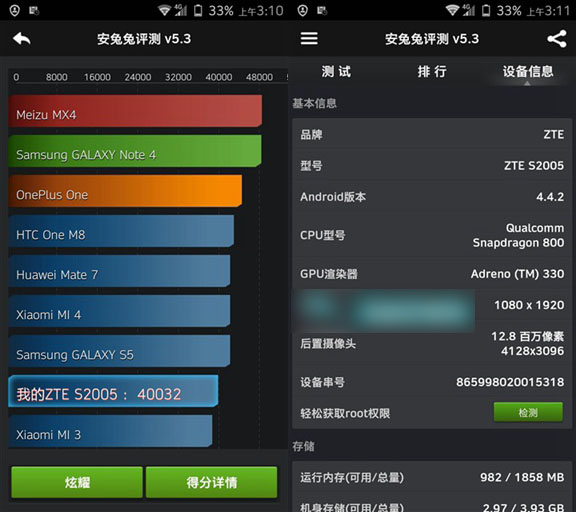 中兴星星2号搭载了高通骁龙801处理器,主频为2.3GHz;内存组合为2GB RAM+16GB存储空间(可扩展);配备了5英寸OGS全贴合1080P屏幕;拥有1300万像素后置摄像头+前置88°超广角500万像素摄像头,后置双色温闪光灯;网络方面,支持移动、联通双4G网络,不过会根据具体的版本进行系统上的限制;电池容量为2300mAh;机身尺寸大小为140.5*69.2*6.9mm,机身厚度只有6.9mm;运行最新的MiFavor 3.0 UI(基于安卓4.4)系统,整体配置属于主流水平。那么星星2号性能方面表现究竟如何呢,接下来让我们一起来对星星2号进行性能测试评分。