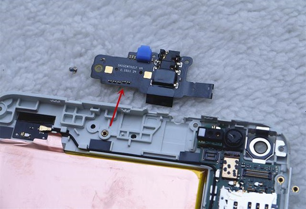耳机接口和降噪处理器模块,也是通过排线连接,但是也有单独的螺丝固定。