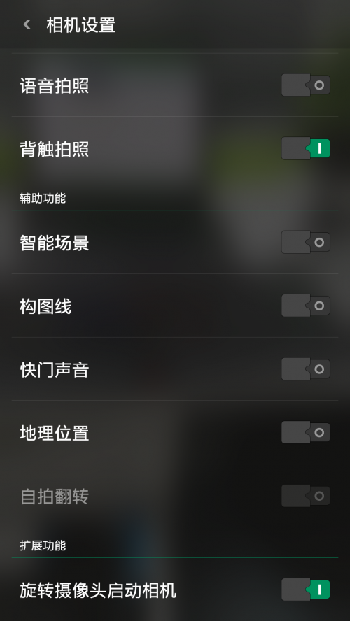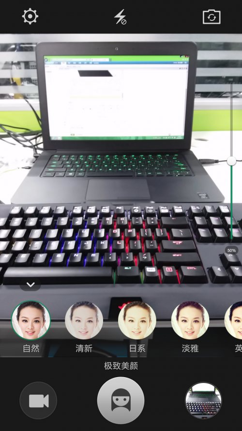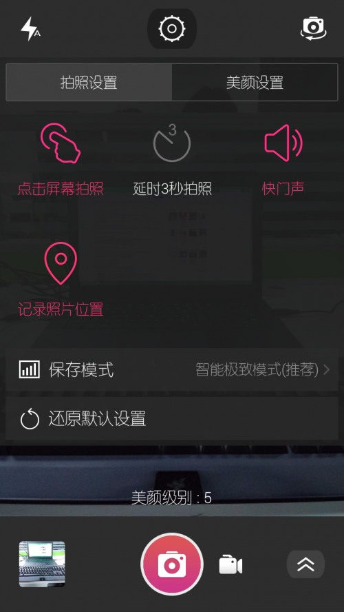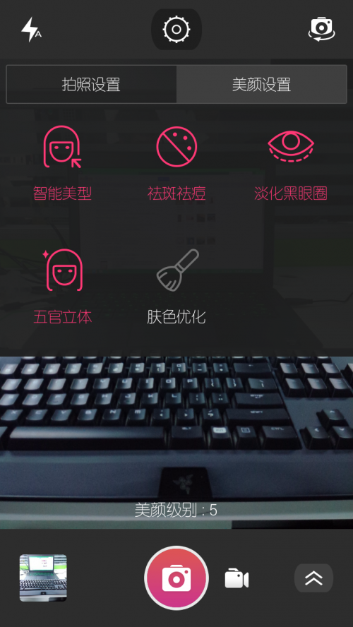 拍照界面顶部中间的齿轮图标点开后就出现了更多拍照功能选项,主要分为拍照设置与美颜设置,显然美颜设置可玩性更高咯,智能美型、祛斑祛痘、淡化黑眼圈、立体五官哪些功能不是女生想要的,简直是太周到了。