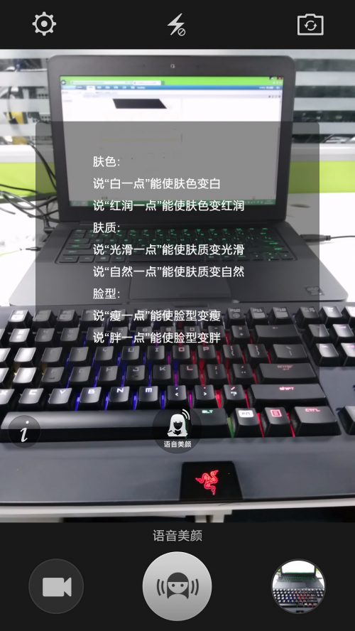 OPPO N3拍照主界面整体观感较为整洁,功能一目了然,最底部左侧为录像,中间为拍照快门,右边为相册,中间有一个功能上拉框,具备:11个实用拍照功能,其中超清画质、自动全景、专业模式、极致美颜、语音美颜、HDR是平时用的较为频繁的功能,尤其是自动全景功能则完全发挥了电动旋转摄像头的优势,不需要用手水平位移了,极致美颜就不多说了,保证可以让你美美哒,而语音美颜请看图3,分为肤色、肤质、脸型共6条语音命令,只要一字不错的对着手机说出来那么照片就会有相对应的变化。