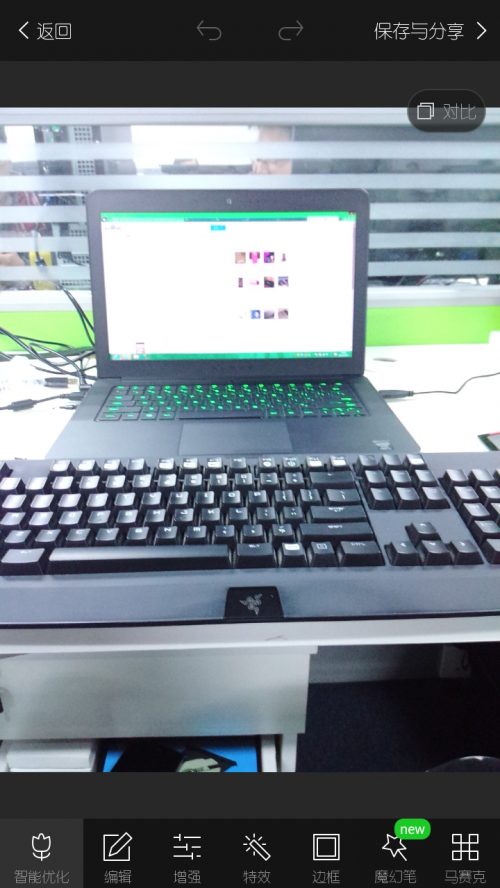 美图手机2的拍照界面看起来比OPPO N3显得复杂一些,上图主界面中间为拍照快门键,左侧为相册,右侧为摄像,最右侧的上箭头点开后就会出现美颜级别1-7的选择,下图为强大的照片编辑功能,简直就是将美图秀秀整合到手机里,你想要的特效都一个不少,在这方面美图手机2的编辑功能显得趣味性更高。