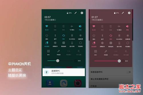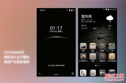 首先在解锁和主屏界面,仅看解锁界面,画面还保留了安卓5.0较多的元素,并且解锁界面相对较为简约。但是进入到主屏之后拟物化并加入了过多效果的图标设计令中兴AXON天机的主屏和解锁界面视觉统一性不高。不过中兴AXON天机的图标可以进行整套不同风格的修改,壁纸、色彩设计以及特效都可以进行调整。