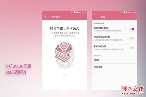 指纹解锁方面中兴AXON天机解锁速度表现不错,准确率也很高。在小编十次测试中,中兴AXON天机响应速度都比较迅速,震动回馈于屏幕亮起之间偶尔会需要毫秒级的等待,但是手指稍微沾水的情况下解锁并不乐观,湿手操作并不能够成功解锁。