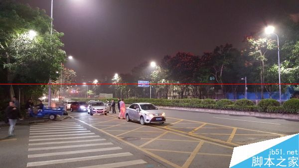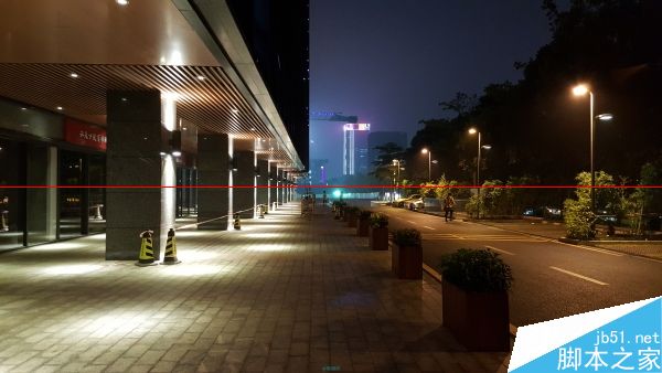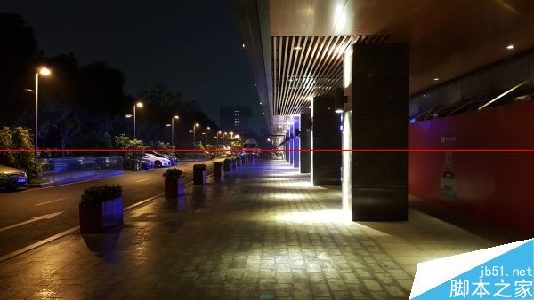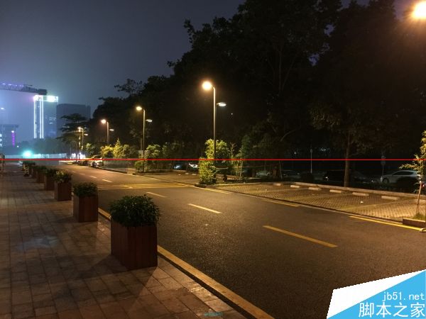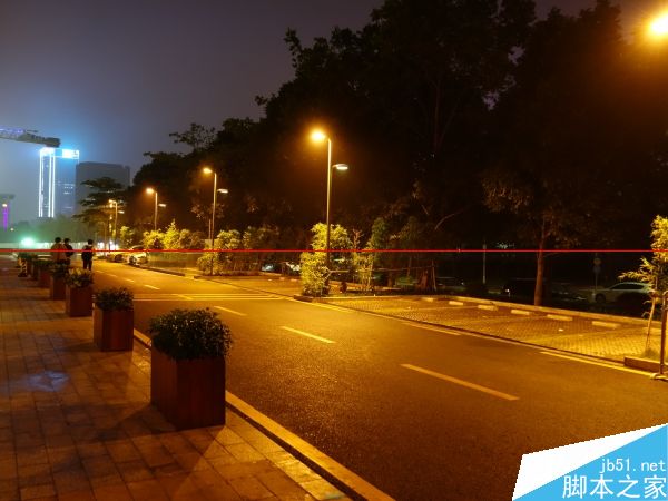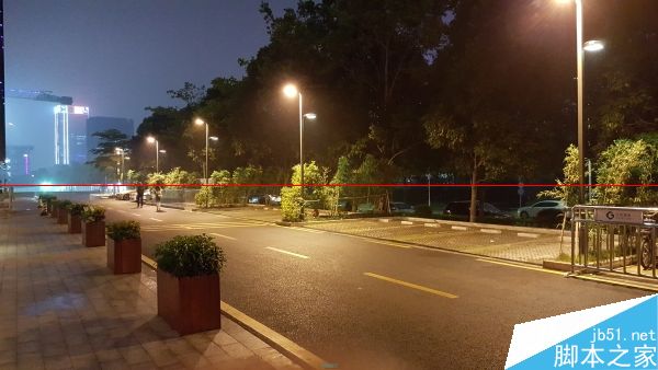 在同样的地点转换一下视野,将对焦点对准灯光下的竹子,此时iPhone 6 Plus过度渲染绿色的色彩还原就相当明显了,灯光下的画面细节表现S6 Edge优于iPhone 6 Plus,像素数量优势没什么好说的,值得一提的是,S6 Edge在这个场景之中对于泊油路面的纹理都有不错的保留,而QX100在这一场景如果只使用自动模式进行拍摄的话,白平衡就会偏黄得厉害,所以在这一场景下,S6 Edge是最接近真实情况的。