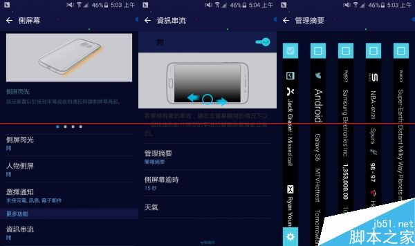 此外因为S6 Edge的屏幕曲面部分相对于Note Edge要小得多,所以S6 Edge的曲面屏功能也少了不少,也只是有简单的通知显示和某些国内网站不存在的信息流和天气预报而已,侧屏APP没有出现,息屏的时候摩擦一下预先设定好的侧边,侧边就会亮起显示资讯。