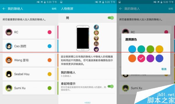 而三星为了不让这个侧屏显得很鸡肋,就加入了最多能放下5个联系人的侧屏联系人界面,5个联系人对应5种能够自定义的颜色,来电的时候会波浪闪动,但是并不像许多人想象一般是两边闪,实际上是只有一边闪的……