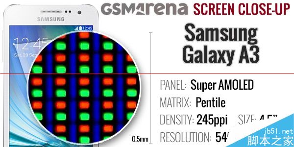 A3的4.5英寸qHD屏幕折算下来的ppi在245,这个参数放到今天,即使是对于一款大品牌的中低端手机来说也不够看了,分辨率首先就成了一个硬伤,在屏幕材质上三星依旧选择了自己惯用的Super AMOLED屏幕,只不过在A3上面的子像素排列方式略有不同,A3的屏幕子像素排列类似于Note 2的屏幕子像素排列方式,AMOLED也提供了不错的可视角度,尽管在大角度下还是有不可避免的色彩偏移情况出现。