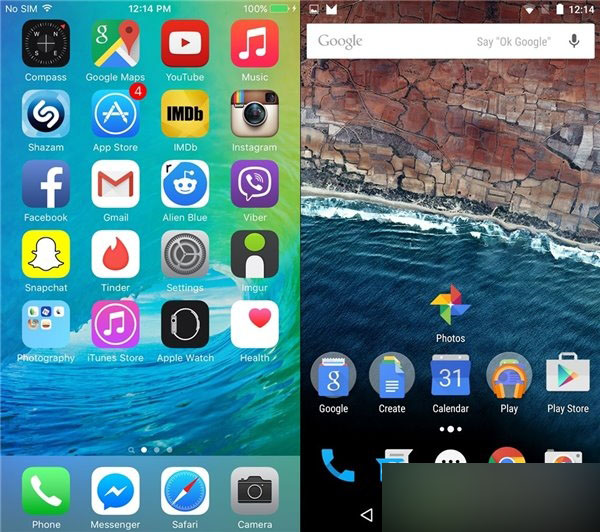 主屏幕:就主屏幕而言,两者几乎没有太多的改变,iOS9最大的变化就在于全局字体的替换,之前的Helvetica Neue字体被Apple Watch上的San Francisco所取代,Android M使用的依然是robot字体。虽然只是细节上的调整,但这可能会影响用户的整体体验,而且是较长时间的影响。