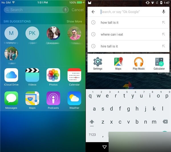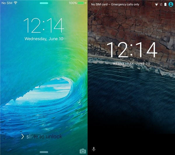 锁屏界面:Android M取消了之前锁屏界面上的拨号快捷图标,原位置现在被“语音搜索”所取代。iOS9上,苹果也将把更加积极主动的新Siri图标搬到锁屏界面上。
