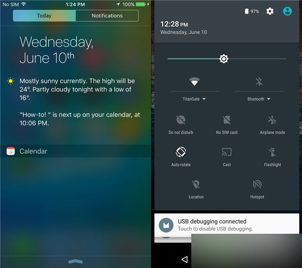 下拉通知栏:Android M新增了一个“勿扰模式”的快捷开关,iOS9则几乎没有任何改变。