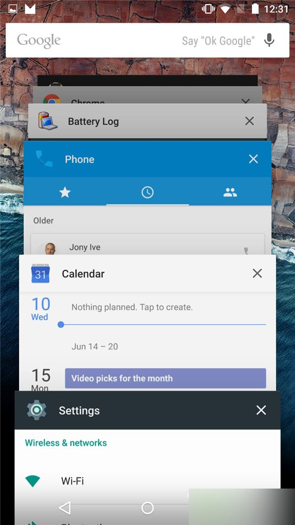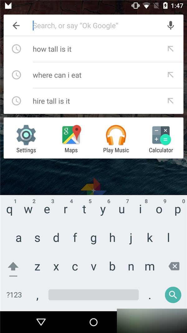 Android M方面,点击主屏幕上的搜索小工具插件,可以直接在搜索条下方为你提供四个最近使用的应用程序。另外,新版安卓最重要的功能就是“Google Now On Tap”,很可惜的是,在首个开发者预览版中,该功能并无法启用。