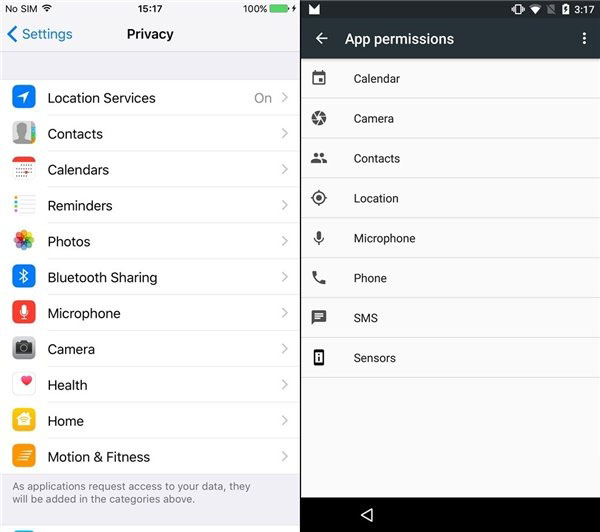 权限管理:Android M自带了权限管理功能,可以通过按权限分类或按应用分类两种方式集中管理权限,而苹果则是更倾向于在应用首次运行时给出用户选择,当然,也可以通过隐私设置进行集中管理。