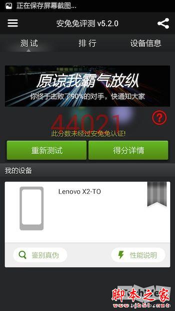 我们用几款常用的跑分软件来考验一下VIBE X2的真实实力。安兔兔性能测试是最常用的测试软件,里面涵盖了内存和闪存、CPU、图形、SD卡读取/写入等测试项目,并给出一个综合性分数。最后得出的分数,基本上能比较准确的表示你的手机属于那一个性能阶梯。在安兔兔测试中,联想VIBE X2最终得分44021分,虽然与魅族MX4的5万分还稍有差距,不过也足够与众多采用高通骁龙801的机型抗衡了。