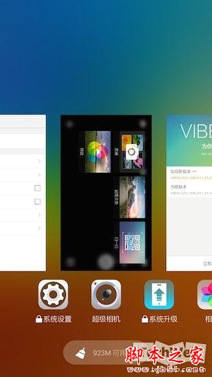 长按底部的Home键,则可以开启VIBE UI 2.0的任务管理器界面,从这里可以方便的查看到近期使用的应用程序,向上滑动还可以直接将应用清理出内存。如果有太多程序需要清理,则可以直接点击画面左侧的一键清理按钮就可以快速释放内存。