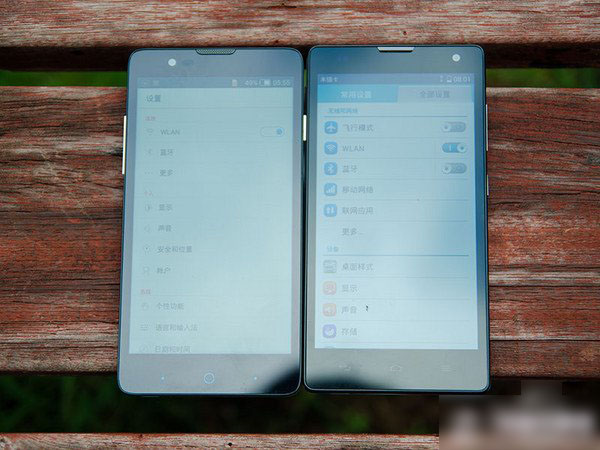 先来看看两者在强光环境下的可视效果。在室外晴天的环境下,笔者把荣耀3C 4G版和红牛V5的屏幕亮度均调到了最高。大家可以看到,两款机型在强光下环境下的显示效果基本是一致的,均能够清晰地看见屏幕内容,亮度也能够满足观看。但比较有趣的是,由于荣耀3C 4G版的界面字体比较粗,比较大,在这种环境下观看屏幕内容会相对容易;而红牛V5的系统字体和图标比较小,字体没那么粗,所以看起来会稍微吃力一点。