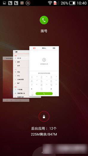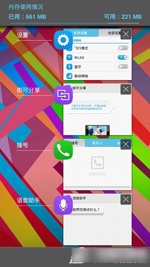 多任务界面方面,荣耀3C 4G版是常规的卡片式缩略图样式,支持查看内存和一键清理后台;而红牛V5的则要更加好看和炫丽,采用了标签式的多任务界面,并且操作是支持动态效果,非常好看。