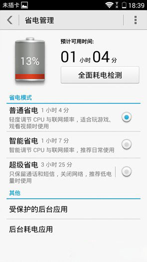 荣耀3C 4G版系统中自带省电模式程序,支持普通、智能和超级省电模式;而红牛V5的就是内置了牛仔电工这款程序,也是十分好用的。