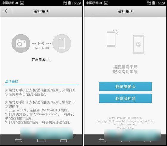另外华为P7系统中还内置了“遥控拍照”应用,这属于华为自己研发的一款应用,在同一局域网下,可以讲手机作为远程摄像头或遥控器。