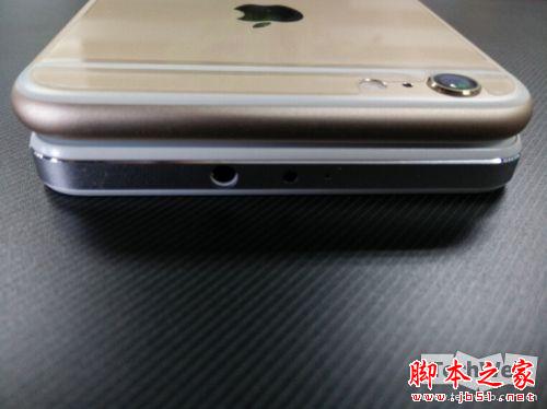 iPhone 6 Plus与荣耀6 Plus的底部与顶部对比,首先iPhone 6 Plus采用了圆润的机身,所以机身显得更轻薄,三围为158.1x77.8x7.1mm,重量为172g,具备3.5mm耳机接口与Lightning数据接口。