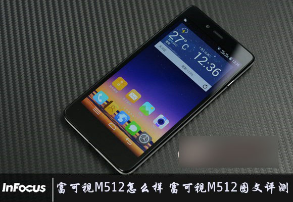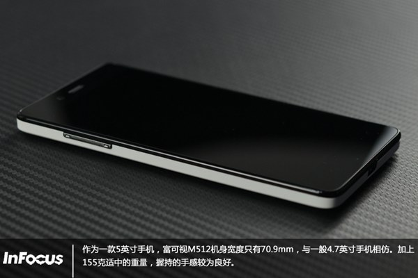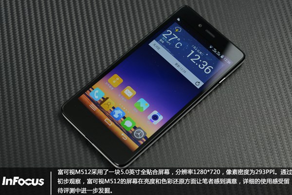 富可视M512正面采用了一块5英寸全贴合屏幕,分辨为1280*720,像素密度为293PPI,通过初步观察,富可视M512的屏幕在亮度和色彩还原方面让人满意。