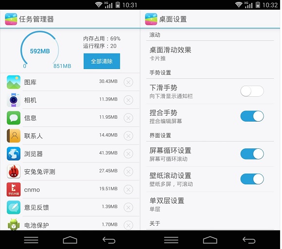 富可视M512系统的屏幕解锁方式依旧是滑动式,不同的是在触摸屏幕解锁时会跟随手指的滑动轨迹产生动画效果。系统的整体设计延续了之前扁平化的风格,Android系统自带的例如后台、多任务管理器、桌面设置、手势操作等功能都可以在富可视M512身上找到,功能上还是很全面的。