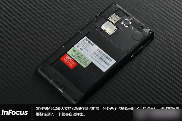 其他方面,富可视M512内置了2500mAh容量电池,对于一款5英寸720P屏幕手机来说,内置电池容量中等。值得一提的是,尽管富可视M512采用了可拆卸后盖设计,不过并能随意拆卸电池。
