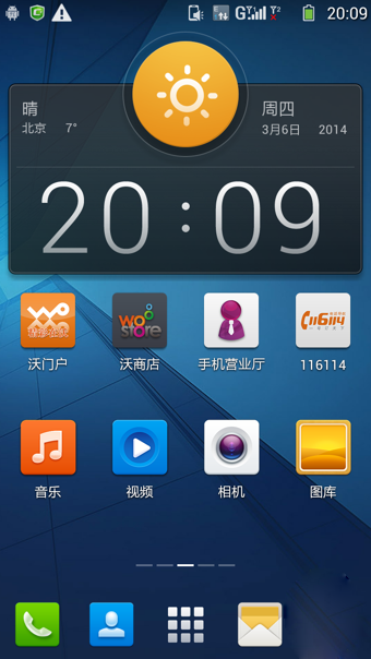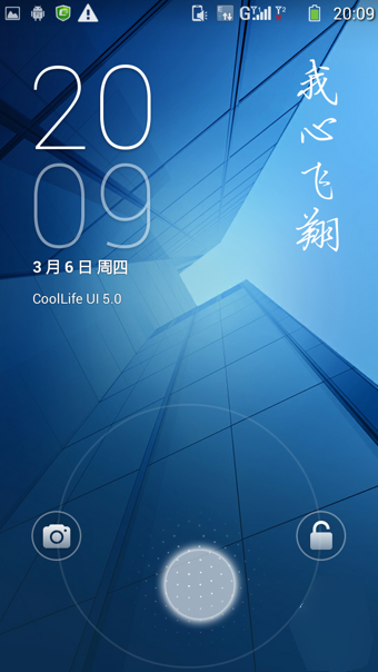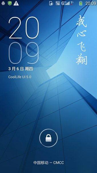 酷派春雷HD的解锁界面中时钟与默认壁纸的搭配,让这款手机看起更加具有沉稳的气质。