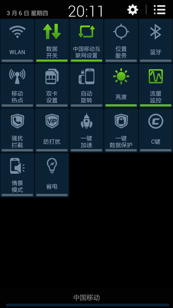 酷派春雷HD的下拉通知栏可以显示的条目和可设置的快捷开关,使用起来非常方便,快捷开关支持左右滑动以调出更多选项。进入编辑模式,可以长按并移动调整快捷菜单的顺序位置。