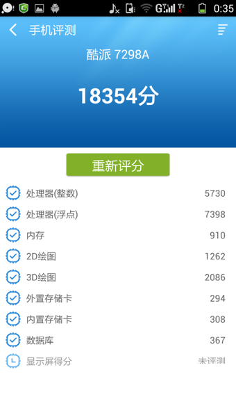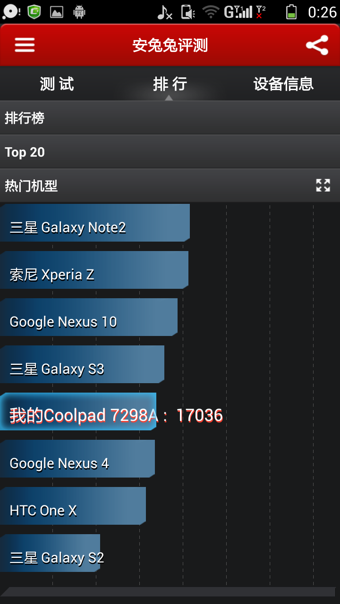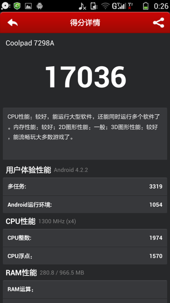 酷派春雷HD搭载1.3GHz四核处理器,1GB的RAM,4GB的ROM,最大可扩展到32GB。这款手机在性能方面的表现如何呢?虽说跑分并不能说明全部的问题,但还是先让我们跑一个分吧。