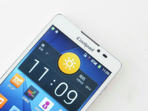 手机正面上部分是听筒、200万像素前置摄像头和酷派Logo的位置。手机正面下部分则是菜单键、HOME键和返回键的位置。整体看上去,整个手机屏占比属于中等水平。