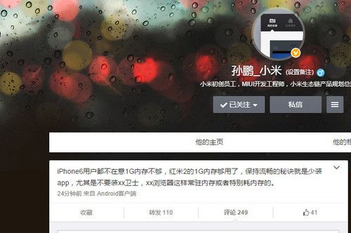 记得今年初小米推出红米2代手机,虽然该机处理器升级至骁龙410,但RAM依然是1GB,这遭到不少网友吐槽,并且小米公司高管发了一条微博称“iPhone6用户都不在意1G内存不够,红米2的1G内存够用了,保持流畅的秘诀就是少装app,尤其是不要装xx卫士,xx浏览器这样常驻内存或者特别耗内存的。”这一言论引来众多网友狂喷,毕竟iOS和Android是两个截然不同的系统。