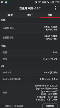 从安兔兔评测软件的跑分来看,该机20475的得分虽然不高,但在同类产品里也不算低。此外,如果两款产品同时搭载骁龙410处理器来运行游戏,必定是RAM(运行内存)大的那个首先加载完毕,这就像用小口径的瓶子和大口径的瓶子比赛装东西一样,肯定是大口径的瓶子装的快。
