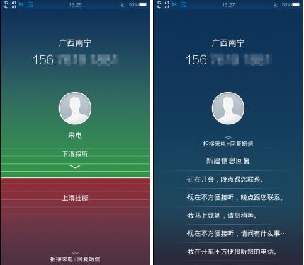 来电界面,是非常讨人喜欢的设计风格,向下滑动接听、向上滑动挂断,划断同时支持回复信息告知对方,非常人性化。