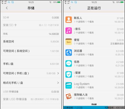 机身存储可用空间,开机运行微信与QQ后的Ram可用空间为500MB左右。