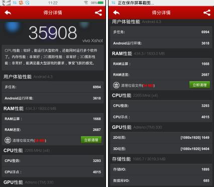 其实如此强悍的配置,跑分仅仅是一个心理安慰了,没听说过骁龙800系列处理器、2GB的内存手机还有卡顿的手机了。实际的游戏运行起来也是各种游戏都兼容,大到1G多的飚车等大型游戏,小到打飞机的小游戏通吃,并且无卡顿非常流畅。唯一需要说明的是,长时间运行后,背部的发热量相对较明显。同时,2GB的运行内存已经足够,如果有极致的要求,那我更建议你买3GB旗舰版的vivo Xshot,各方面都会符合你的需求。