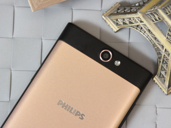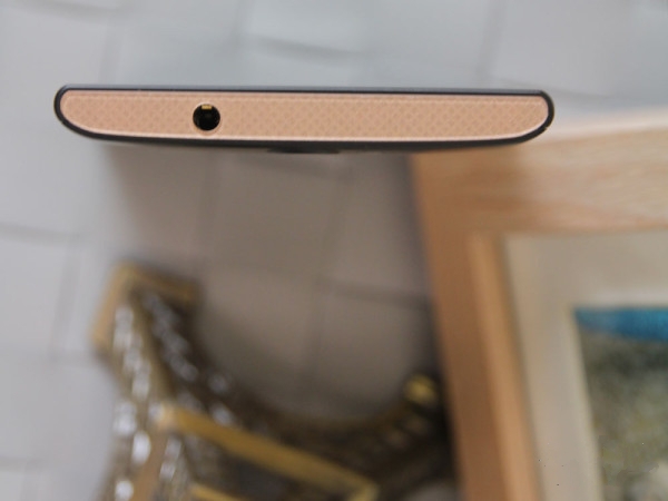 飞利浦S396机身顶部及底部也采用香槟色,并配上方格网纹,看上去并不单调。机身左、右两边各为音量键、开机键。顶部有一个3.5mm的耳机插口。底部是USB口和一个降噪麦克风。背部上方内置的800万像素相机和LED补光灯。下方是外放音响。背后摄像头的位置恰好避开了手指遮挡,单手拍照比较方便。