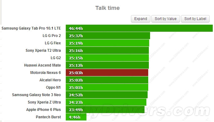 在3G网络下,Nexus 6的通话成绩为25小时03分钟,作为对比,Galaxy Note 4的续航时间为38小时34分钟,HTC M8的表现和Note 4不相上下,而iPhone 6 Plus则是23小时49分钟。