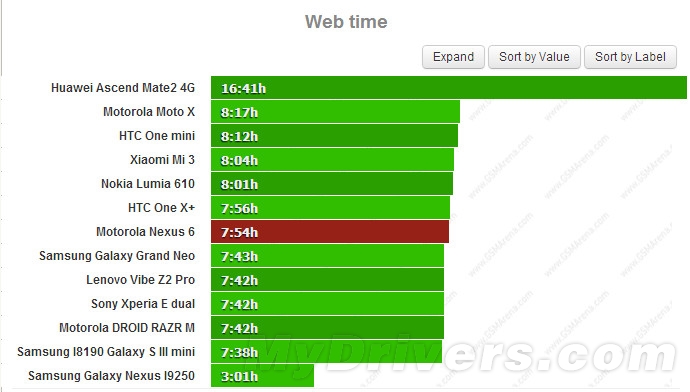 在网页浏览测试中,Nexus 6的成绩为7小时54分钟,作为对比2014版Moto X为8小时17分钟,Note 4为10小时44分钟,而iPhone 6 Plus则是9小时5分钟。