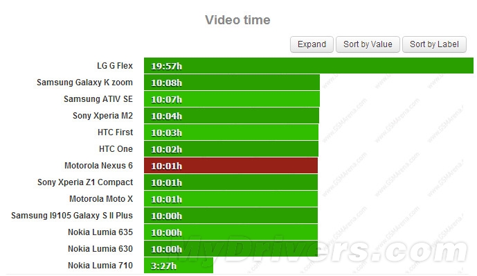 视频播放测试中,Nexus 6的成绩为10小时1分钟,作为对比的Note 4成绩为17小时25分钟,Note 4为11小时15分钟。