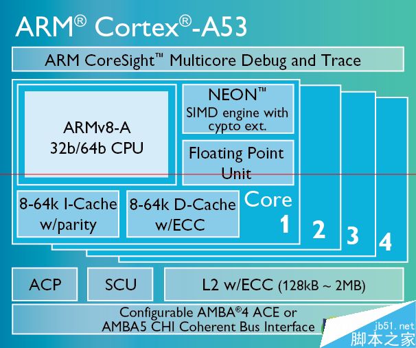 Cortex-A53与Cortex-A57同属于Cortex-A50系列,均首次采用64位ARMv8架构,于去年夏季正式推出,Cortex-A57是ARM目前最先进、性能最高的应用处理器,其号称可在同样的功耗水平下达到当今顶级智能手机性能的三倍;而Cortex-A53是号称是目前世界上能效最高、面积最小的64位处理器,同等性能下能效是当今高端智能手机的三倍。