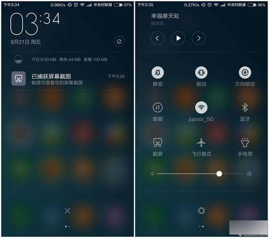 还是采用开关和通知两页设计,滑动切换。快捷开关栏采用半透明简约设计,顶部常驻播放器控制按钮,底部为亮度调节杆。点击开关可实现功能开关,长按则进入详细设置界面,开关顺序也支持自定义排序。