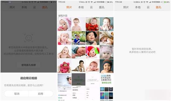 其实就是MIUI 6中的面孔相册。这个功能可以智能识别相册中的面孔,进行自动归类,方便用户管理,对于有宝宝的用户是很贴心的。这些功能需要开启云相册才能使用,经过试验,当照片数量不多时,系统并不能顺利检测到人脸。