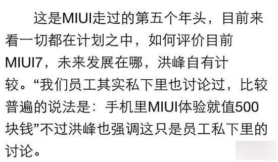 小结:可以说小米的成功就是从MIUI开始,经过五年的发展,如今的MIUI在功能和界面上已经相当成熟,在全球已经积累了大量用户,这也是小米的核心竞争力。关于MIUI,小米工作人员表示其值500元,我们认为这句话是对的。