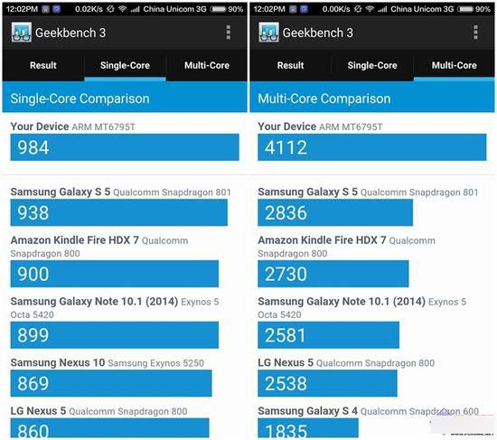在Geekbench 3的测试中,这款处理器获得了单核984,多核4112的成绩,这个成绩相比高通骁龙801也不遑多让,多核成绩甚至比骁龙801还要高出30%,性能出色。
