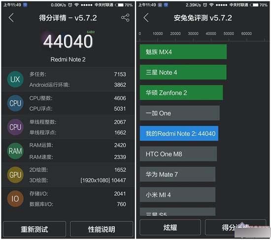 红米Note 2得分达44040,已经是安卓手机前列的表现。
