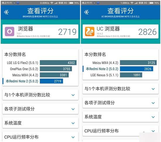 在针对性的浏览器性能测试中,红米Note 2在跑分排行上表现也非常抢眼,在实际的网页浏览中,红米Note 2也表现出了它的实力,网页载入及渲染也很流畅。