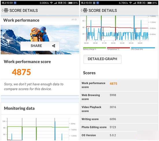 PCMark for Android支持手机和平板,包含Work performancek、Work Battery两个测试项目,可考察设备的性能、电池续航能力,能看出设备在日常使用中的表现。通过测试,红米Note 2在效能表现方面的成绩为4875分。