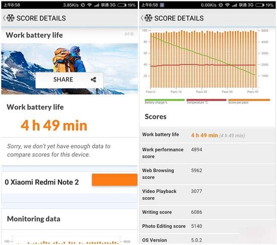 红米Note 2在配备3060mAh的电池容量下,Work battery life的成绩为4小时49分钟,这样的成绩在数据库中比较一般。而在实际的使用中,我们也发现红米Note 2的续航表现的确不够理想,在中度使用情况下,也是刚刚够坚持一天。